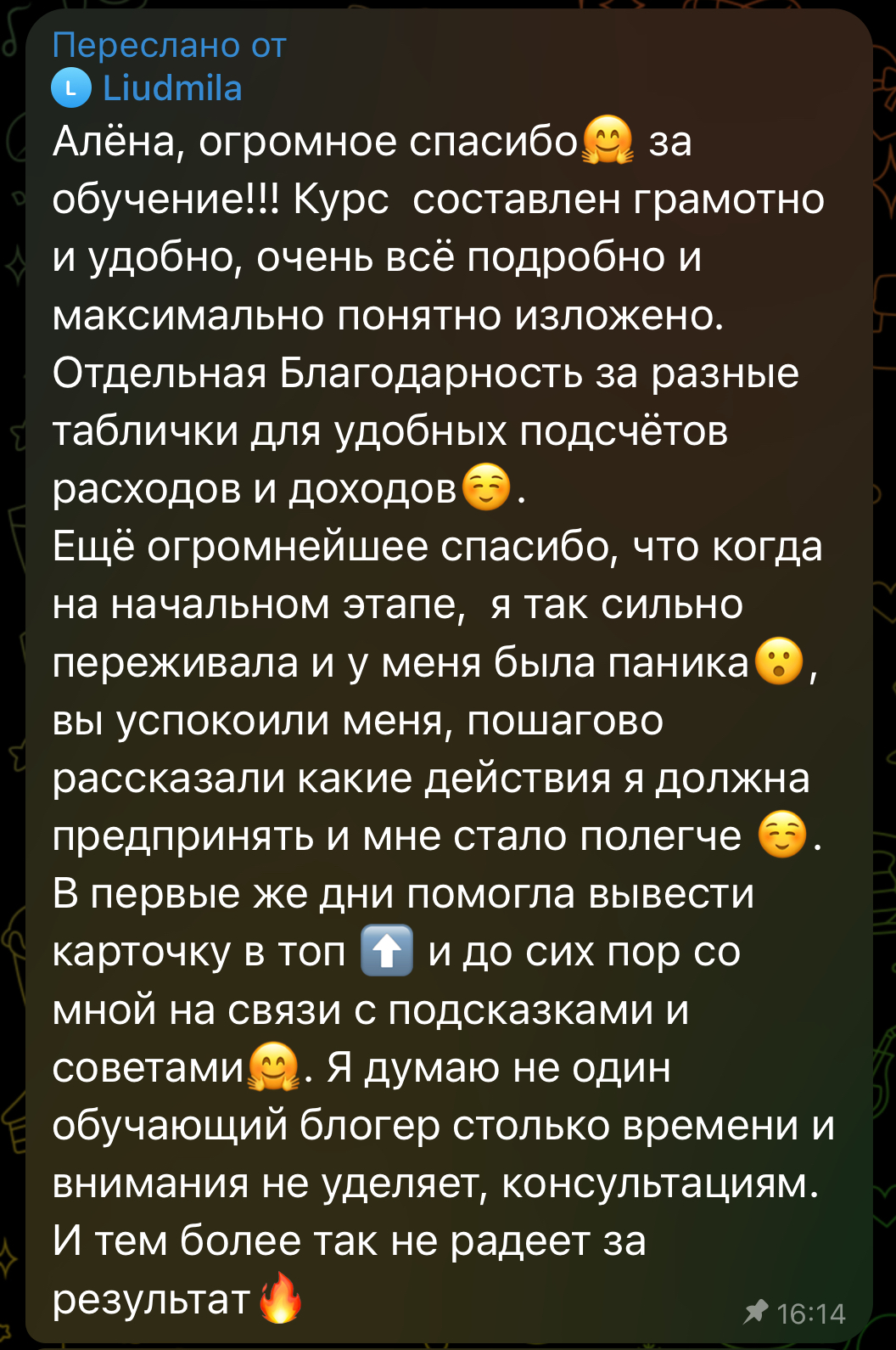 Для тех, кто только планирует свой выход на маркетплейсы или уже вышел и обжегся, предлагаю возможность пройти этот путь с самого 0 под моим чутким контролем как в формате индивидуального сопровождения, так в формате мини-групп (до 6-7 человек).