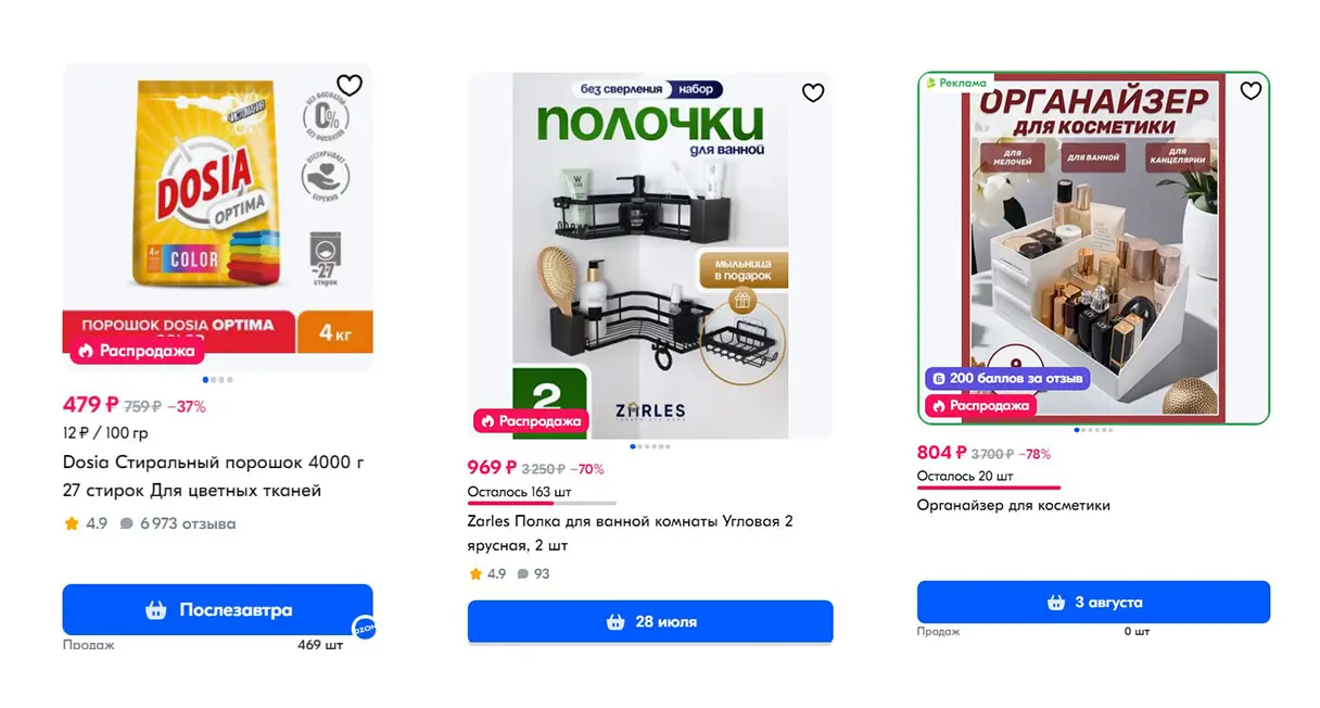 Маркетплейсы добавляют системные элементы поверх изображения: скидки, бейджи «Лучшая цена», «Избранное», промо-плашки и подсказки интерфейса. Эти элементы чаще всего занимают углы кадра и нижнюю кромку, частично перекрывая текст и инфографику. Покупатель не будет «расшифровывать» карточку — он просто пролистнёт дальше.